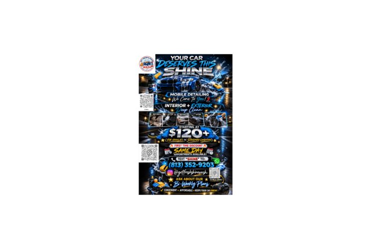 Mobile car detailing service offering interior & exterior cleaning, deep cleaning, shampoo, stain removal, paint enhancement, tire shine, and maintenance plans.